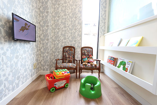 お子様が楽しく待てるよう、絵本やDVDなどをご用意しました。